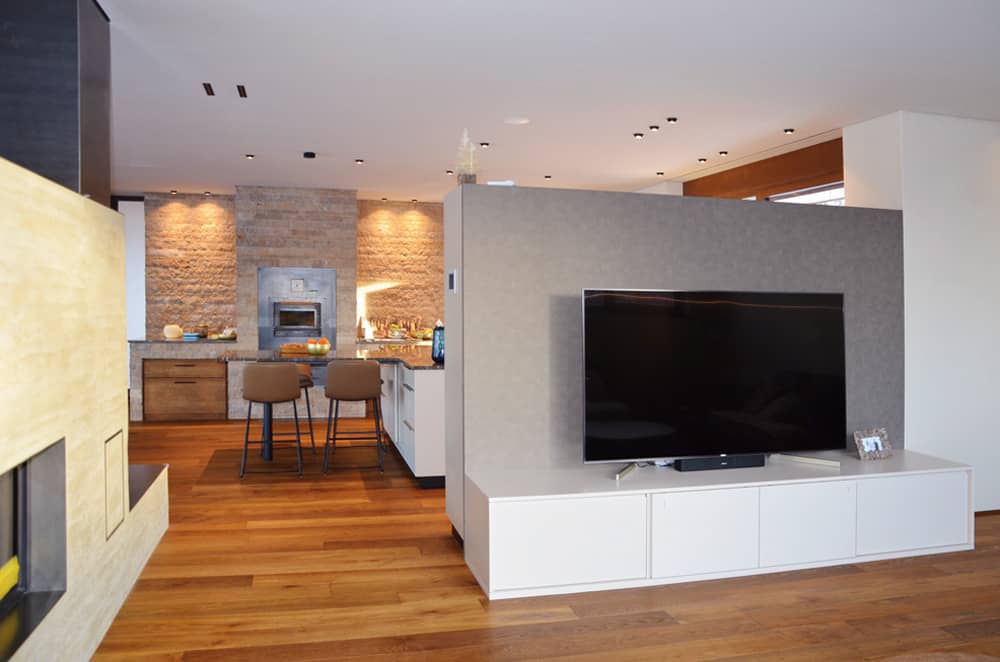 Das Wohnzimmer ist der behagliche Mittelpunkt Ihres Zuhauses. Hier finden Sie nach einem anstrengenden Arbeitstag die nötige Ruhe, um neue Energie zu tanken. Doch das Wohnzimmer erfüllt noch eine weitere Funktion. Es ist ein Ort der Begegnung, der die ganze Familie zusammenführt. Ob Sie sich angeregt unterhalten oder einfach vor dem Fernseher entspannen: Ein harmonisches Raumkonzept schafft das perfekte Ambiente für einen erholsamen Abend im Kreise Ihrer Liebsten.